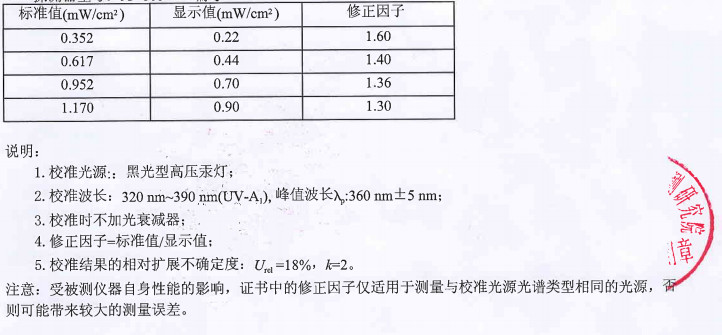 在黑光水銀燈的光源下(相對環(huán)境),對比標(biāo)準(zhǔn)值和照度計顯示值數(shù)據(jù)的數(shù)次對比,得到一個修正因子(也叫校正因子)。測試時,照度計顯示值*相對因子=實際照度。